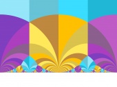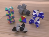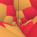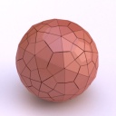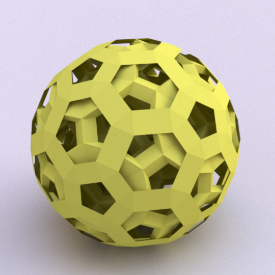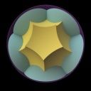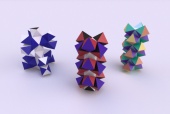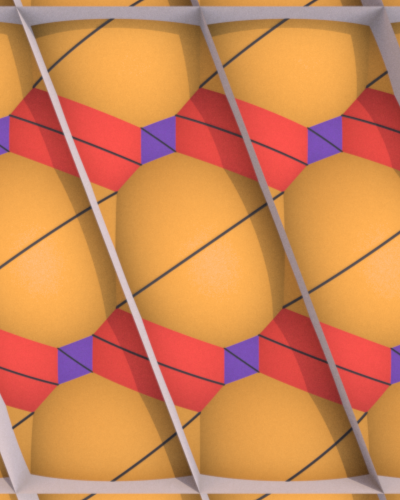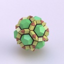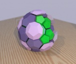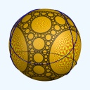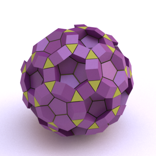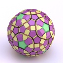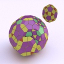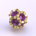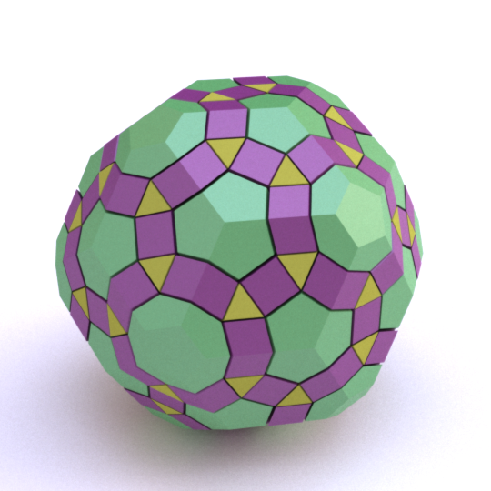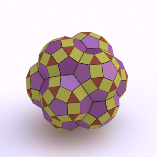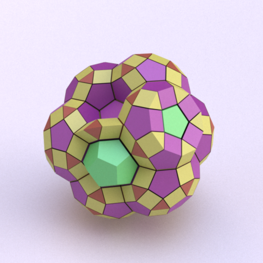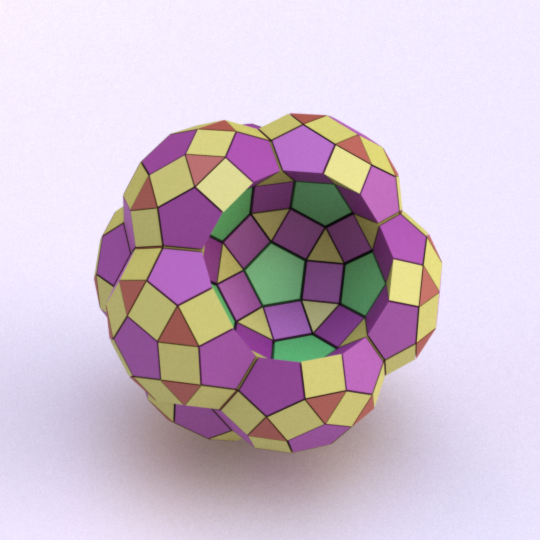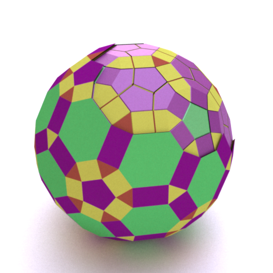 Runcinated 120-cell is a polytope. It is Archimedean in the sense that its organization at every vertex is the same, and all its chambers are Archimedean polyhedra too: regular dodecahedra, prisms with regular pentagonal base and square sides, prisms with equilateral triangular base and square sides, and regular tetrahedra. Here, these objects are respectively represented green, purple, yellow and orange. To represent the object, it is projected orthogonally to the three dimensionnal space and then rendered into a 2D image. We used LuxRender for a photorealistic look.