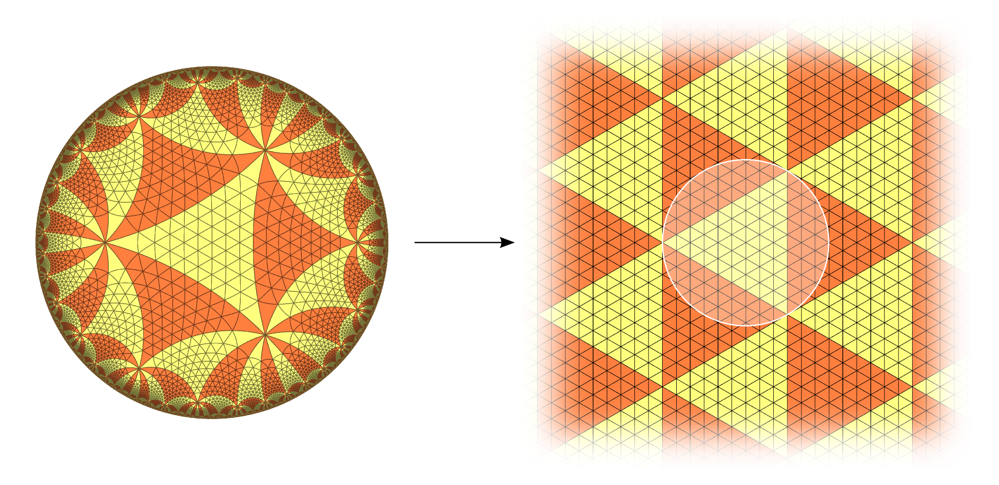| Klein told us: glue this fundamental domain the right way (2 solutions, not so obvious), and you'll get a very symmetric Riemann surface. |