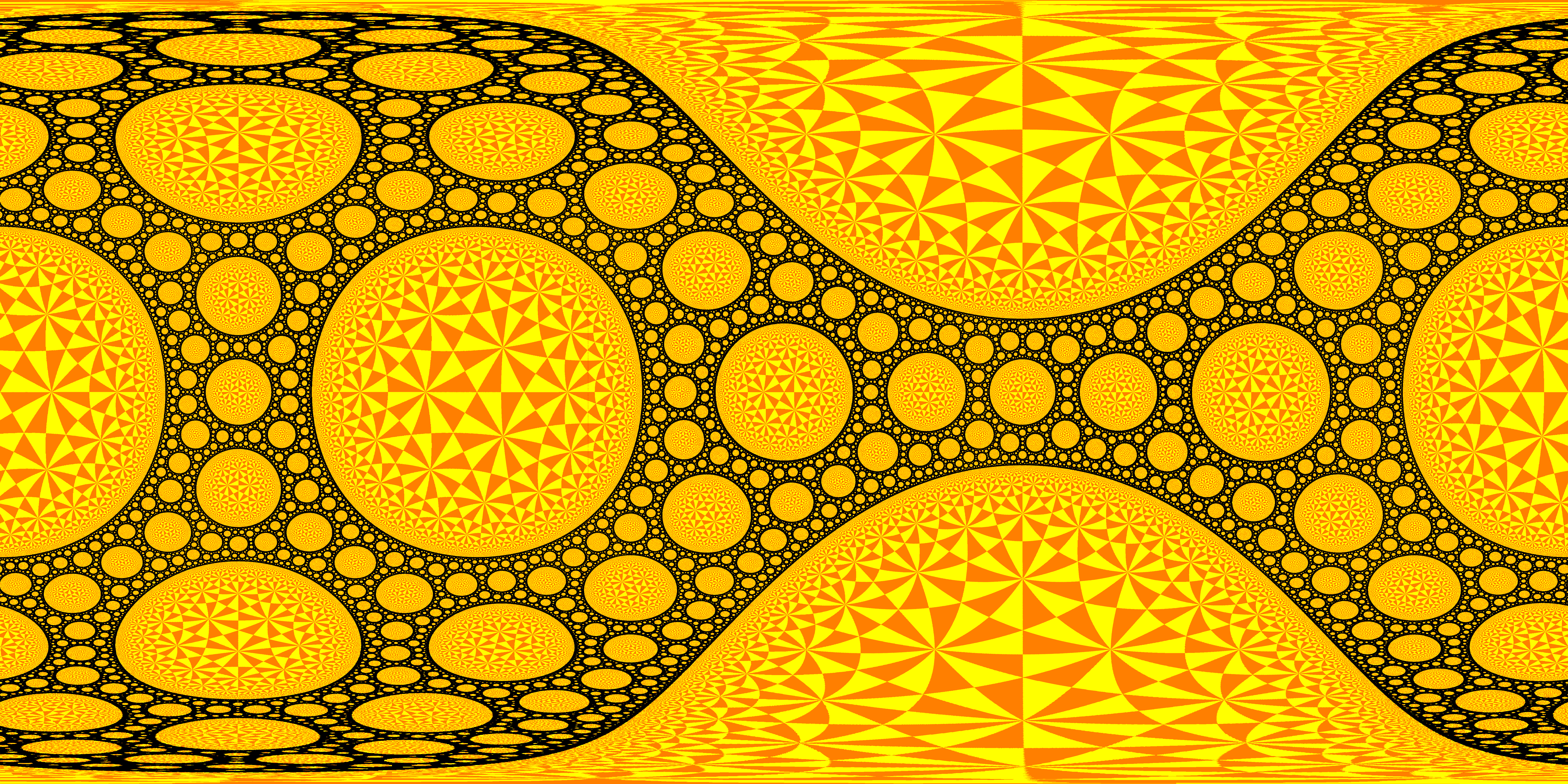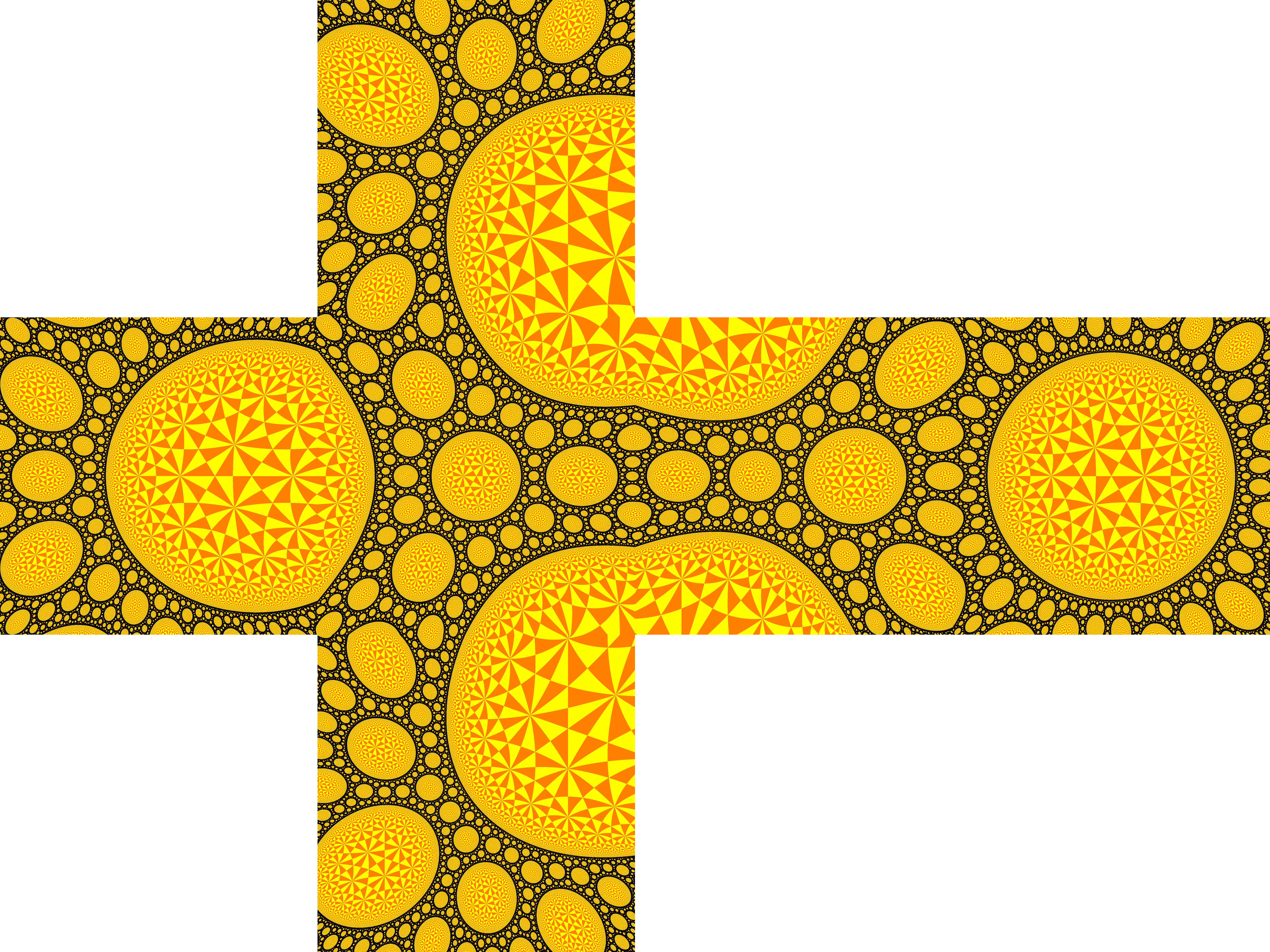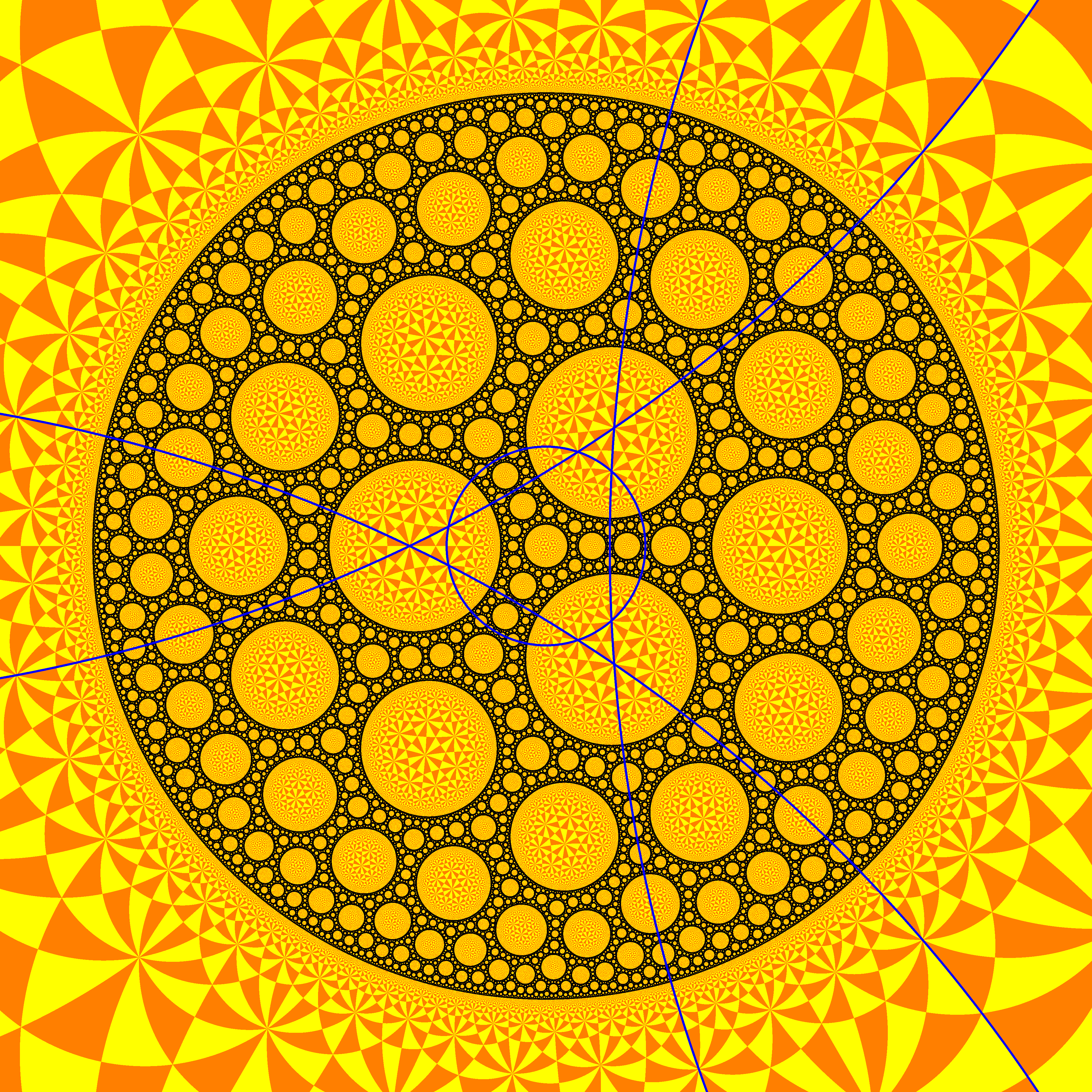 | The group is generated by the reflections along the 4 blue circles. Black: limit set. Yellow tones: generated tesselation in the discreteness set. |
