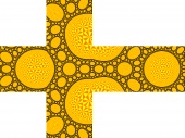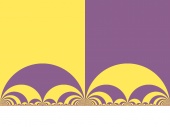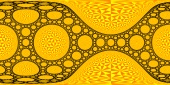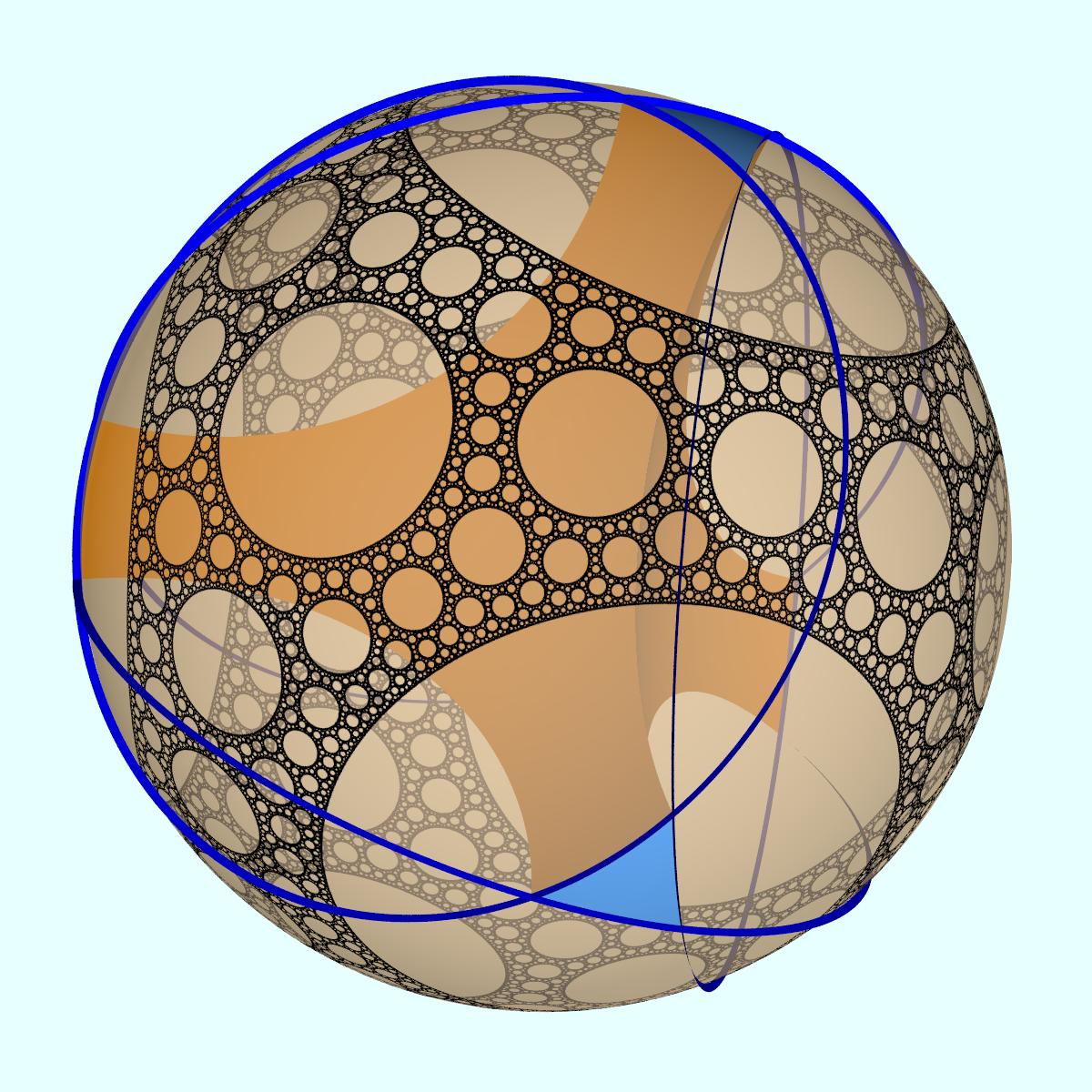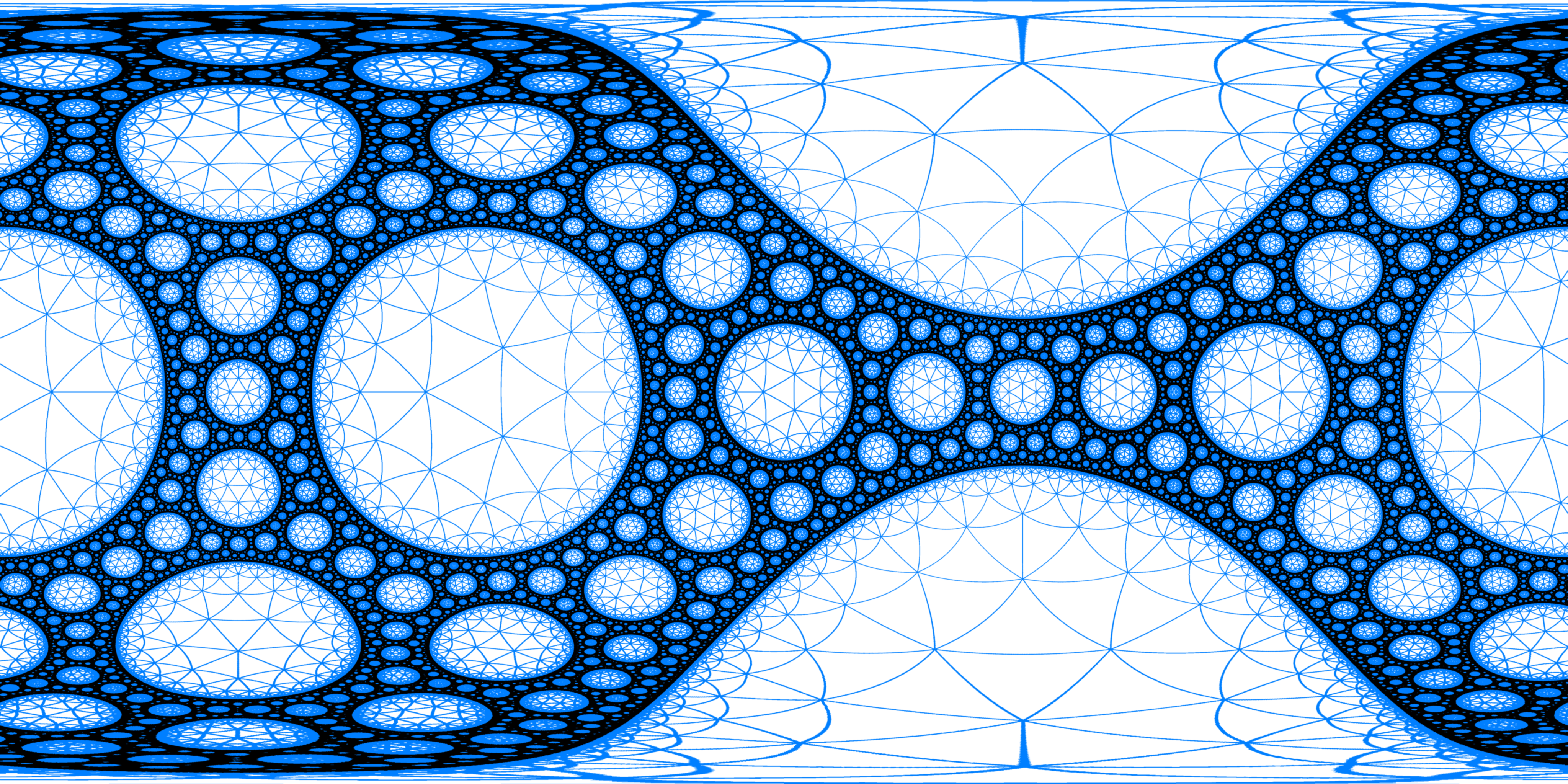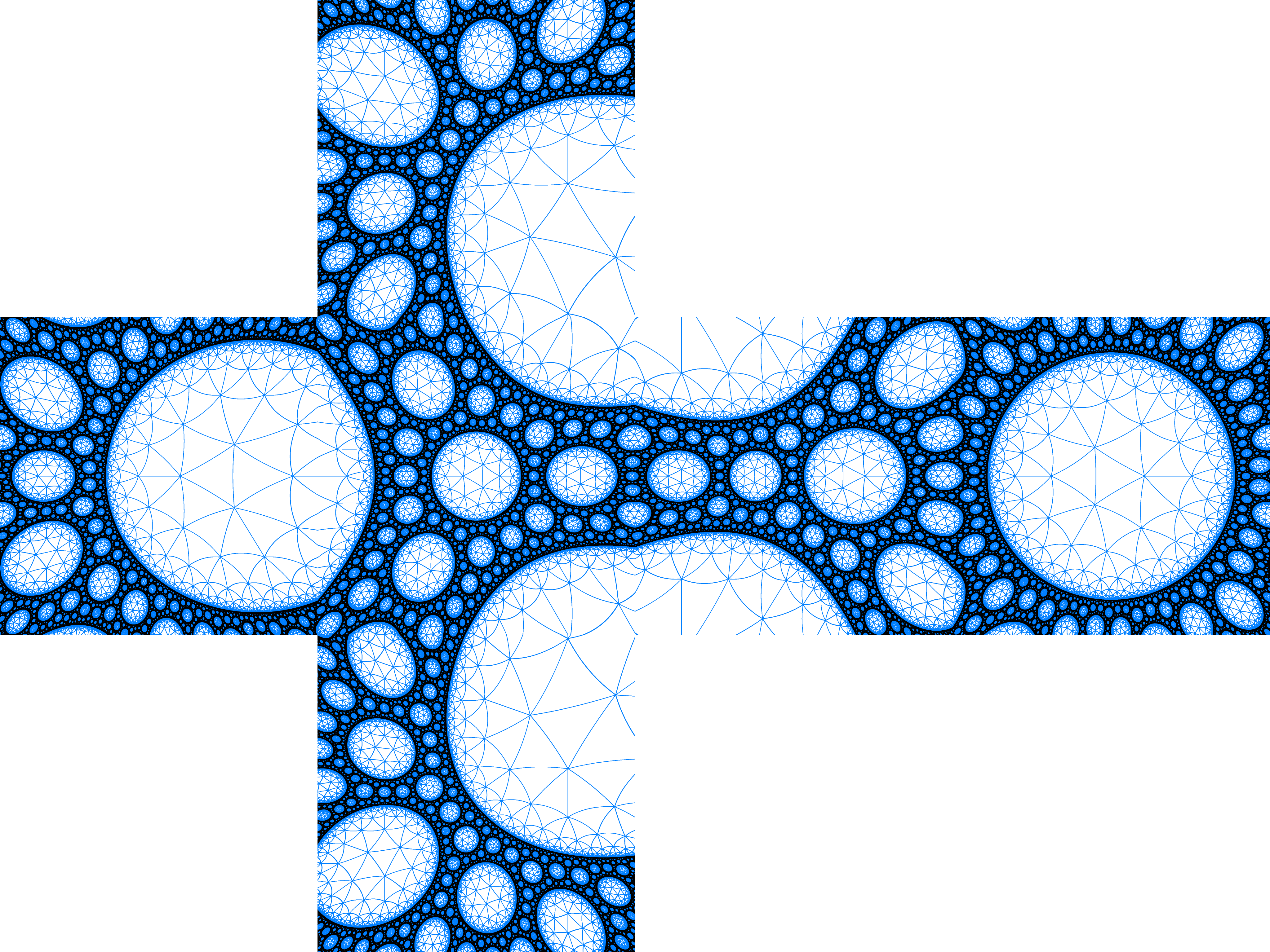 | The group is generated by the reflections along the 4 blue circles. Black: limit set. Yellow tones: generated tesselation in the discreteness set. |