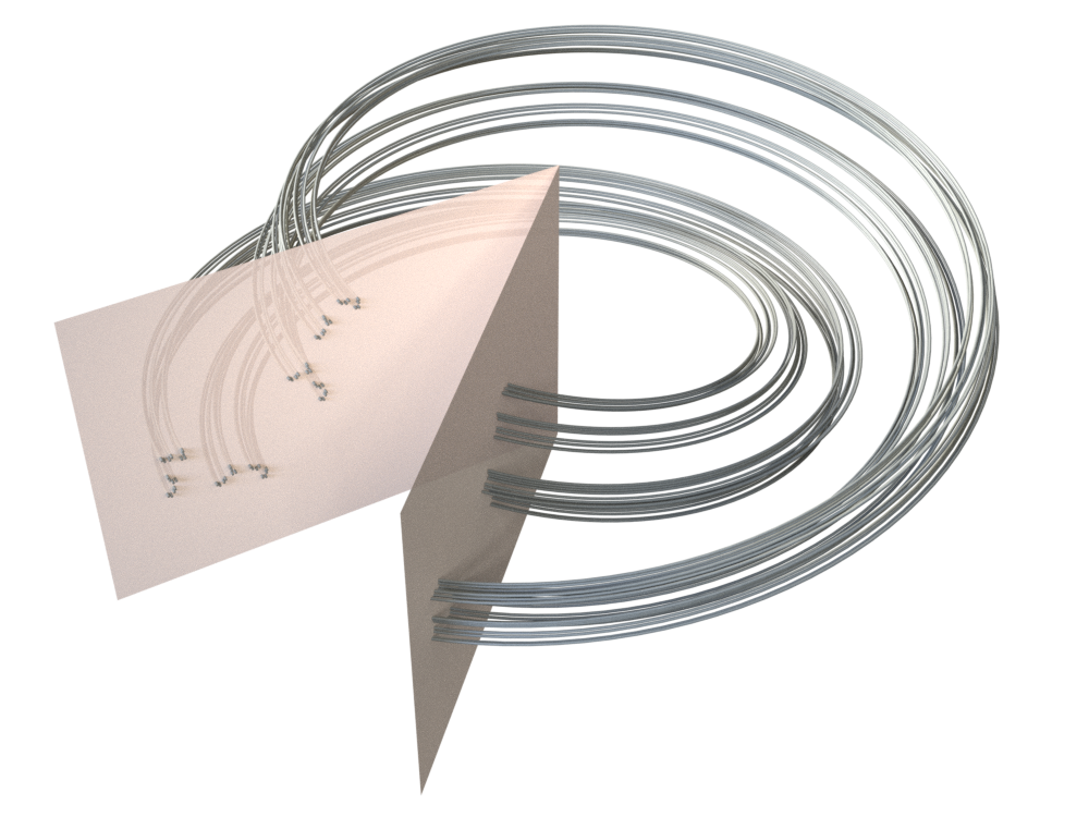 | They are arranged so as to have a tetrahedral symmetry and so that they intersect at angle a turn / 7 |