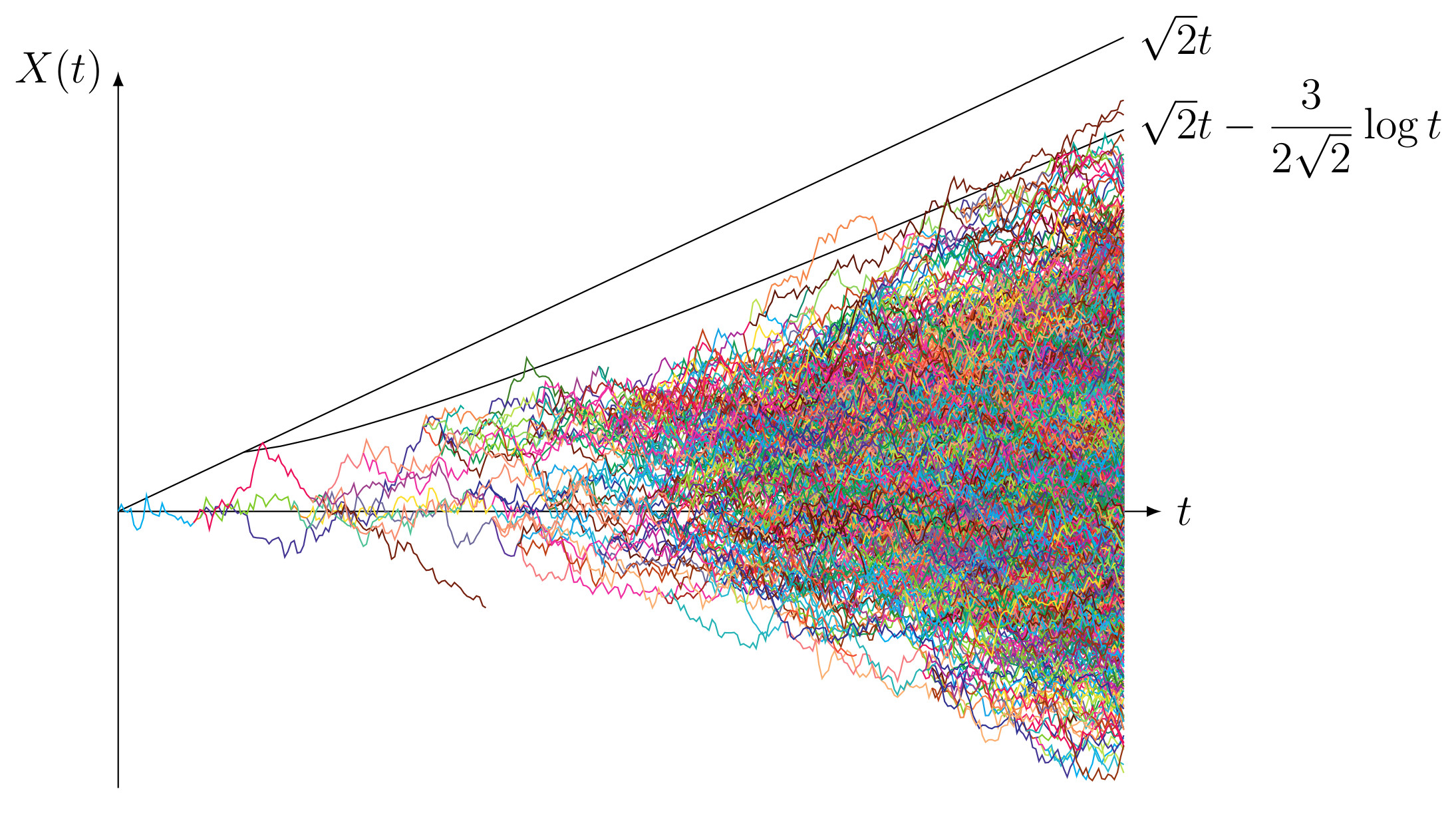 One can replace the binary splitting by a random reproduction: when a particle dies, it gives birth to a random number of children chosen according to a given reproduction law. For example, in the branching Brownian motion below, each particle has 0 child with probability 15%, 2 children with probability 65%, 3 children with probability 10% and 4 children with probability 10%. Hence, the mean umber of children is still 2. A vectorized version of this picture is available here.