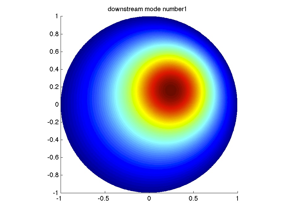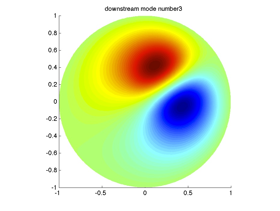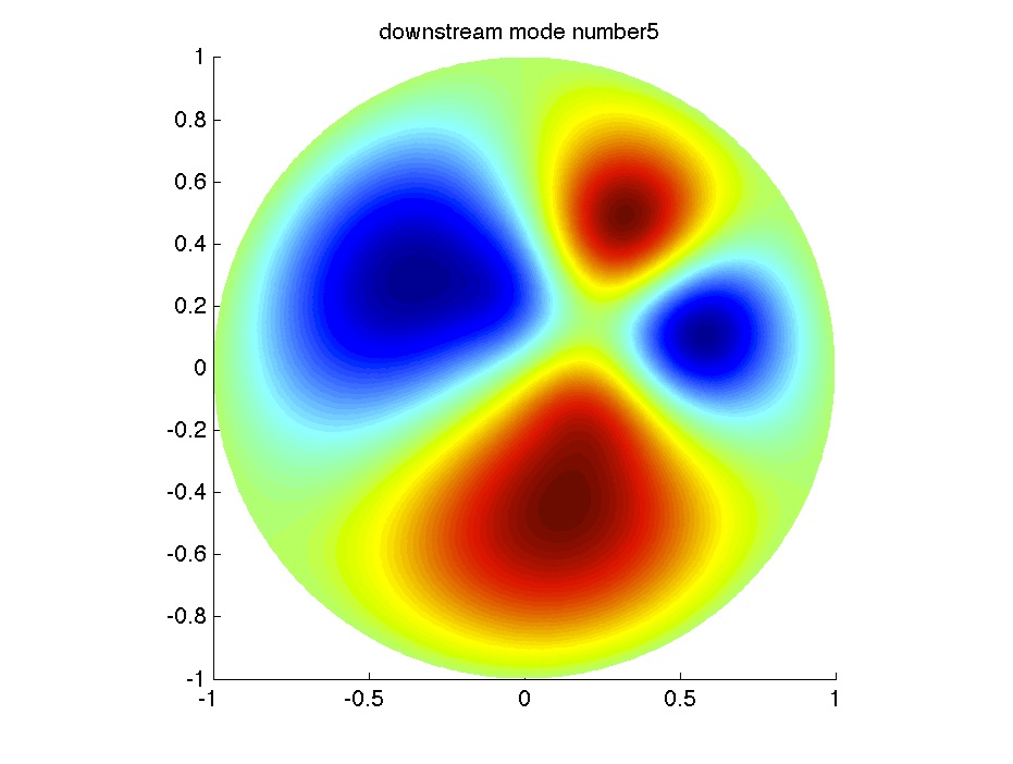 From left to right: the velocity in the fluid domain; first downstream eigenmode; 3rd downstream eigenmode; 5th downstream eigenmode. |